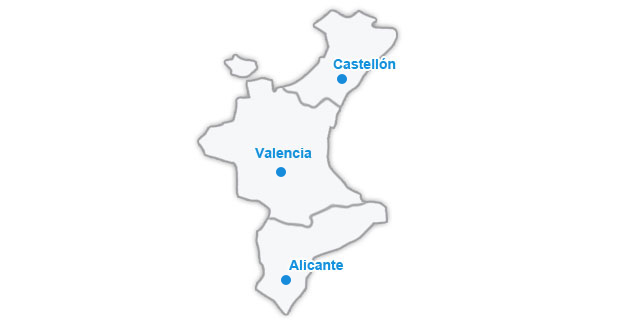 Alzira | Gandia | Cullera | Xátiva | Alcoi | Requena | Buñol | Utiel | Cheste | Chiva | Ribarroja | Godelleta | Paterna | Campolivar | Bétera | Náquera | Serra | Lliria | Sagunto | Torrente | El Perelló | Onda | Vilareal | Castellón | Benicasim | Oropesa | Alcossebre | Valencia | Peñíscola | Borriana | Moncofar | Segorbe | L'Eliana | Puçol | El Vedat | Moncada | Godella | Pobla de Vallbona | San Antonio | La Cañada